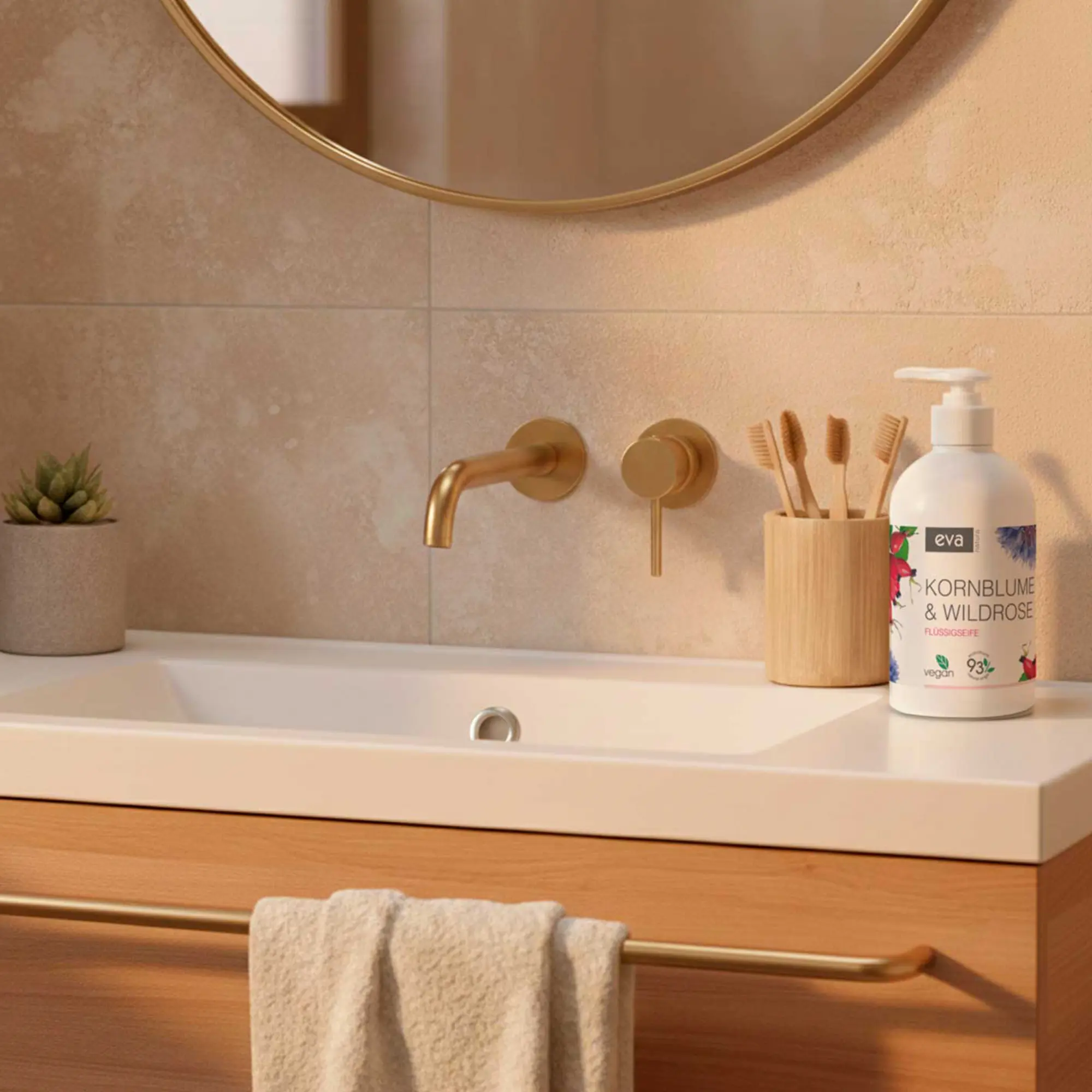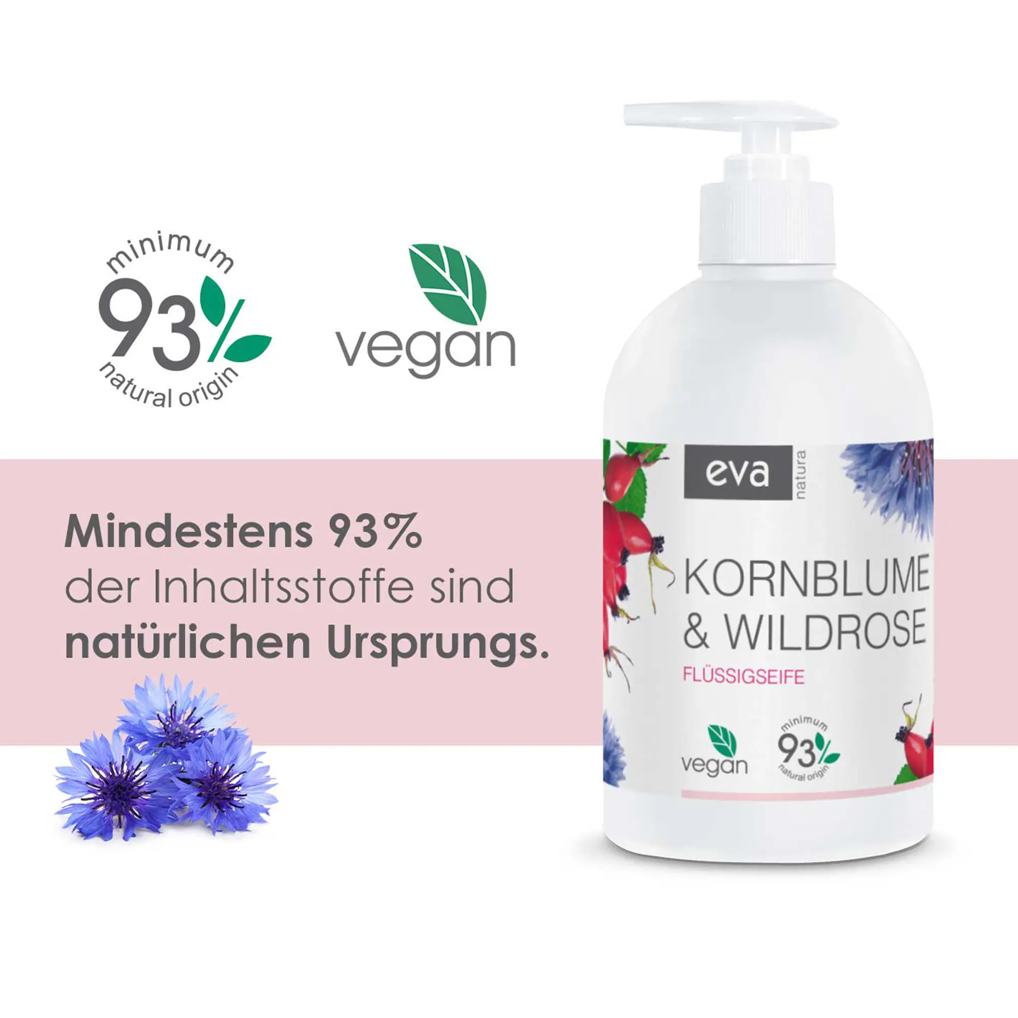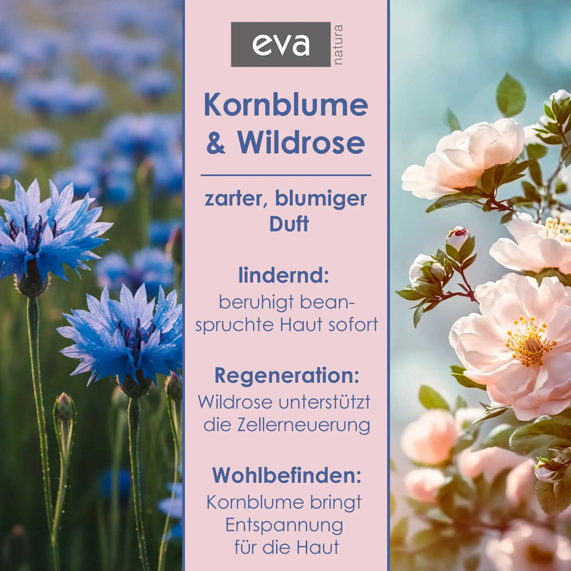 Gönn deiner Haut eine sanfte Reinigung und wohltuende Pflege mit der Eva Natura Flüssigseife Kornblume & Wildrose. Diese milde, vegane Seife kombiniert pflanzliche Extrakte aus Kornblume und Wildrose für ein entspannendes Pflegeerlebnis im Alltag. Die Kornblume ist bekannt für ihre beruhigende Wirkung auf empfindliche Haut, während die Wildrose mit ihren schützenden Eigenschaften und einem zarten Duft verwöhnt.