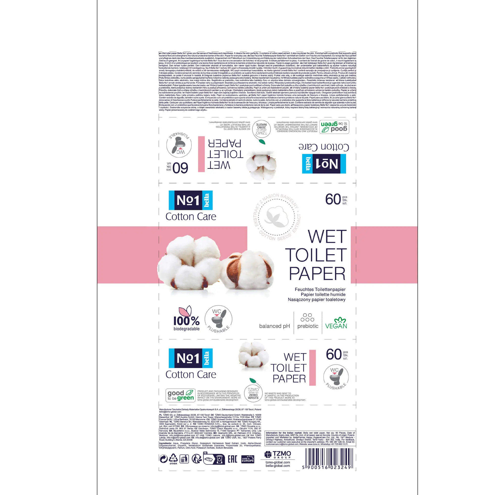 Das bella No.1 feuchte Toilettenpapier Cotton Care ist nicht nur besonders hautfreundlich, sondern auch umweltbewusst. Die Tücher sind 100 % biologisch abbaubar und spülbar, sodass sie bedenkenlos in der Toilette entsorgt werden können. Dank des ausgeglichenen pH-Werts und der veganen Formulierung ist es sanft zur Haut und ideal für die tägliche Hygiene.