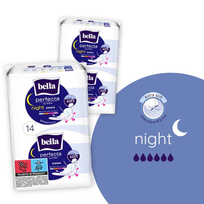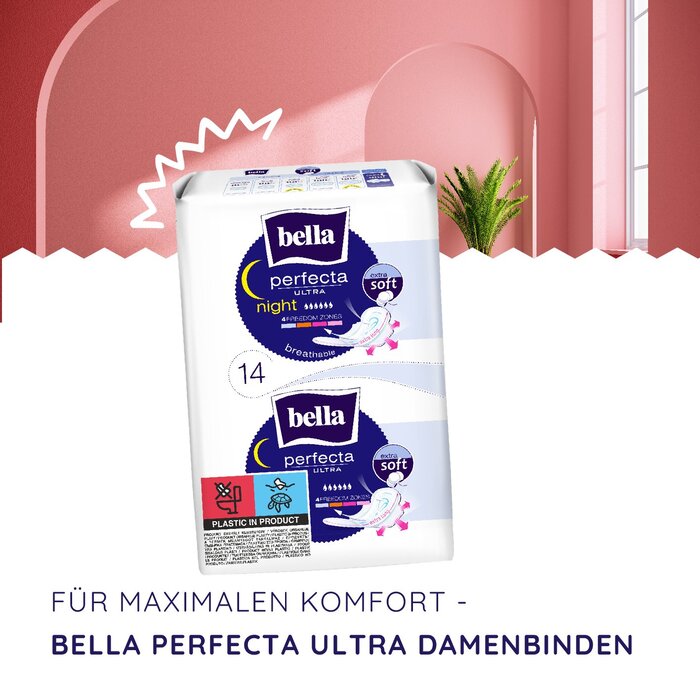 - Speziell für die Nacht: Die bella Perfecta Ultra Damenbinden Night sind extra lang und bieten erweiterten Schutz, damit du die ganze Nacht über sorgenfrei schlafen kannst. Sie sind so konzipiert, dass sie auch bei stärkeren Blutungen optimalen Schutz bieten.
