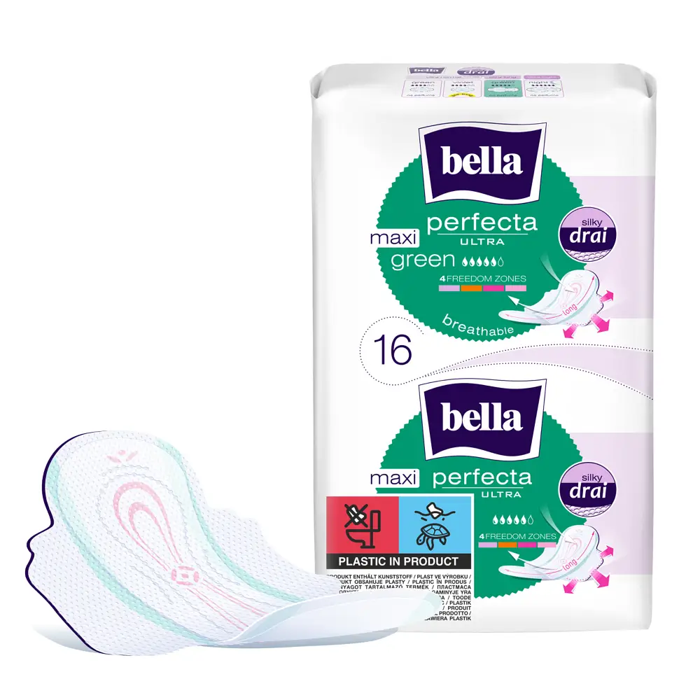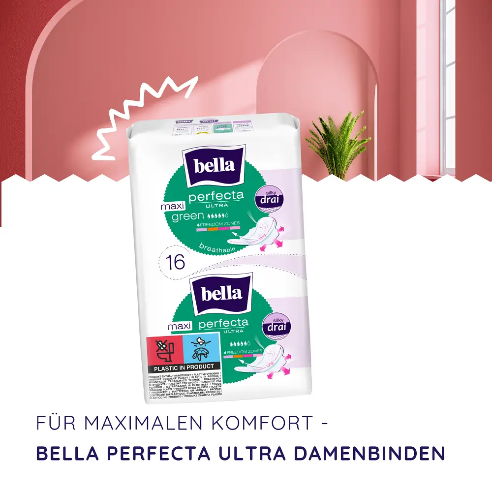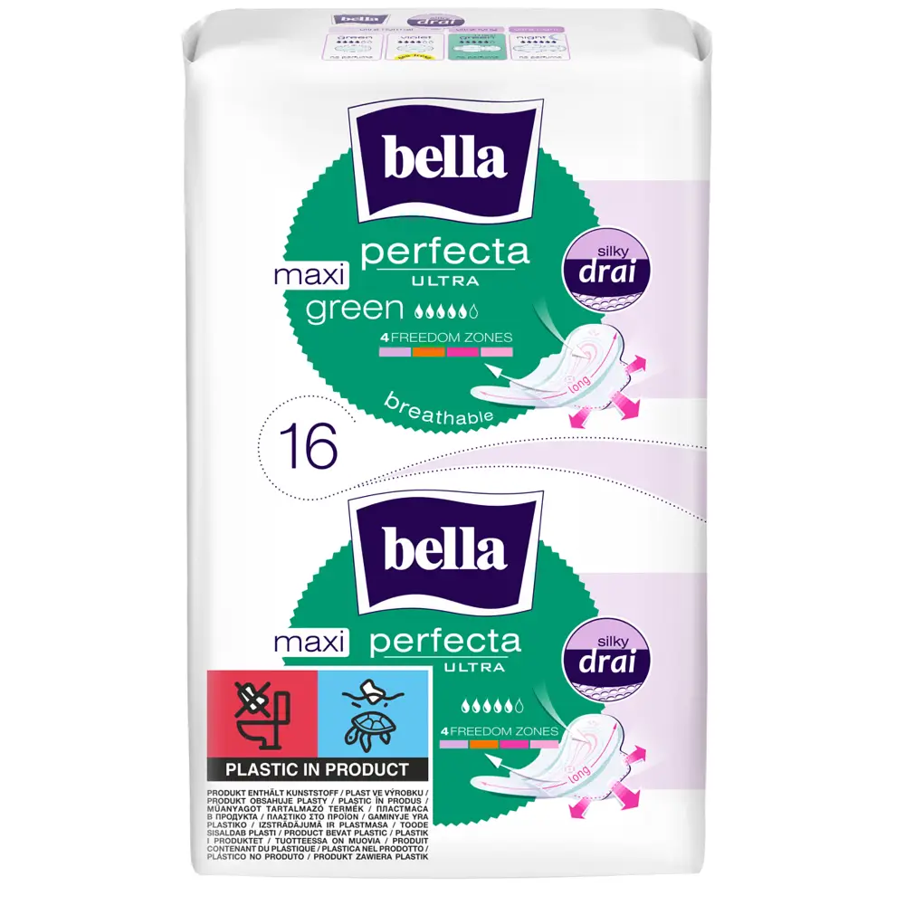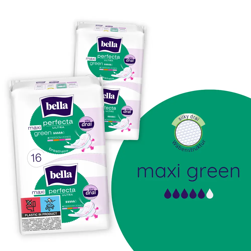 Die bella Perfecta Ultra Maxi Green sind extra lange Damenbinden, die dir auch an stärkeren Tagen ein rundum sicheres und frisches Gefühl geben. Dank ihrer atmungsaktiven Oberfläche und der innovativen Silky Drai Technologie nehmen sie Feuchtigkeit blitzschnell auf und halten die Haut spürbar trocken.