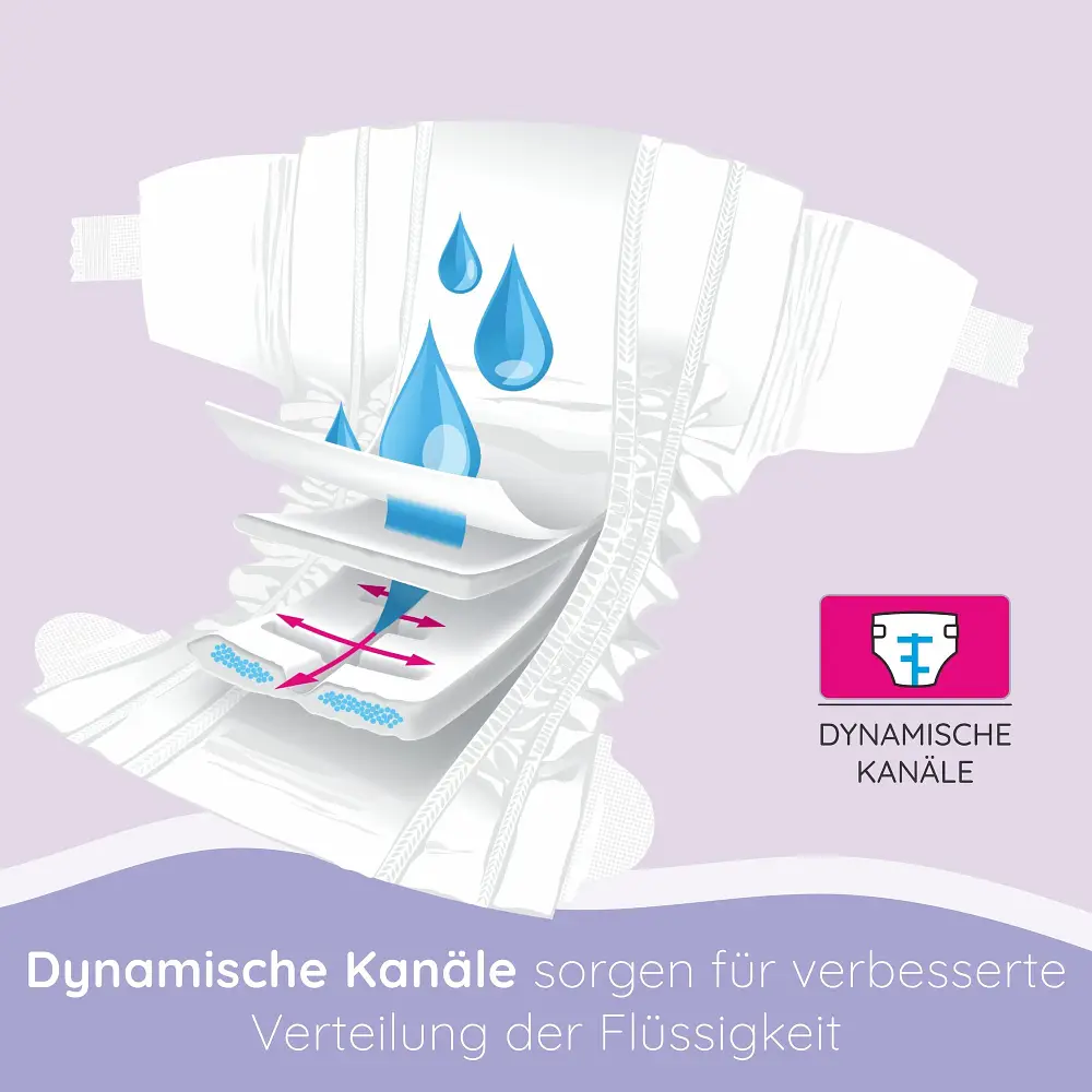 Egal ob euer Baby liegt, strampelt oder schon auf Entdeckungsreise geht – die dynamischen Kanäle leiten Feuchtigkeit zuverlässig ab, für ein trockenes und glückliches Gefühl. - Mit Liebe entwickelt & dermatologisch bestätigt