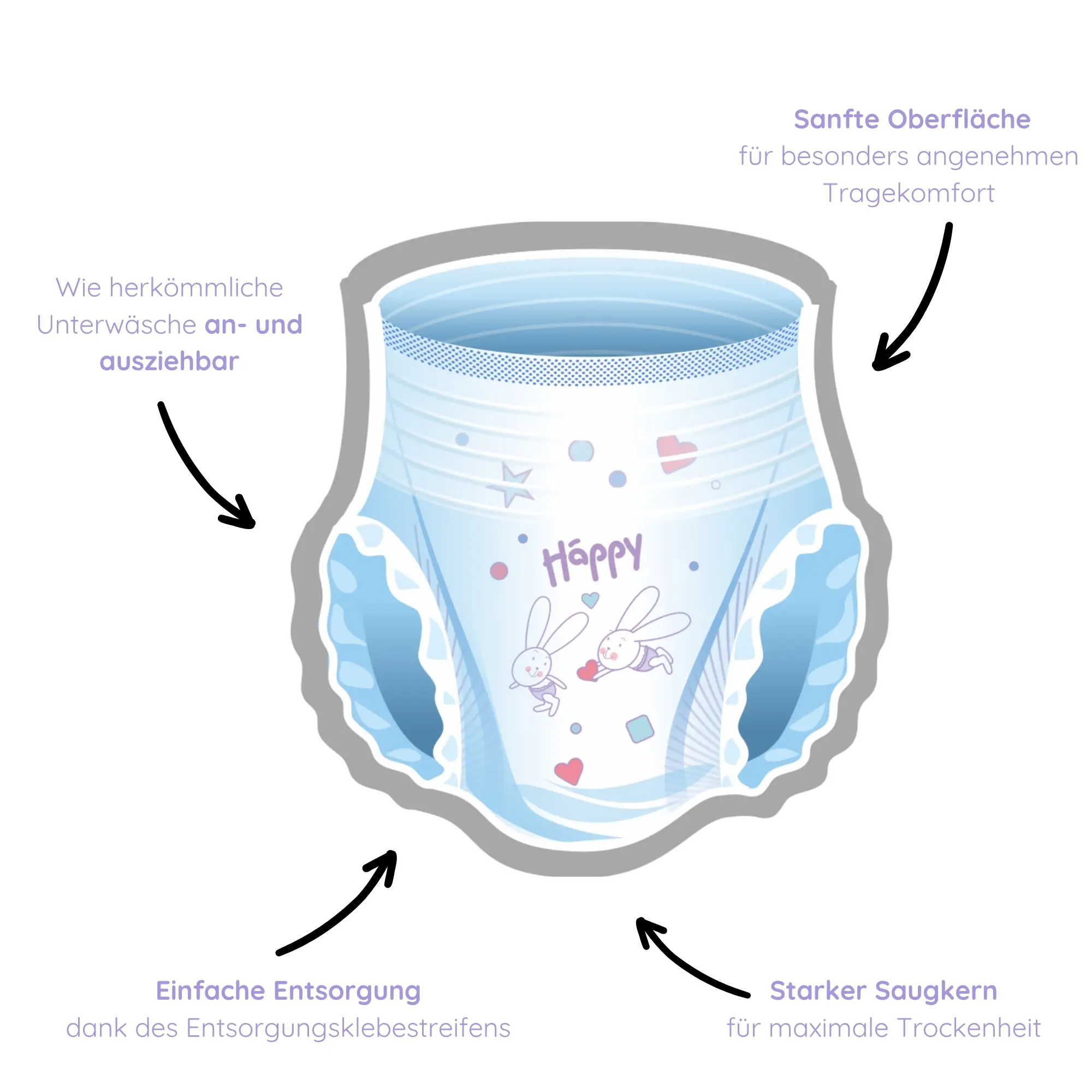Dank des durchdachten Quick & Easy Systems lassen sich die Pants wie normale Unterwäsche hochziehen und bei Bedarf seitlich aufreißen. Perfekt für aktive Babys und kleine Wickelverweigerer. - Extra weicher Bund – für maximale Bewegungsfreiheit