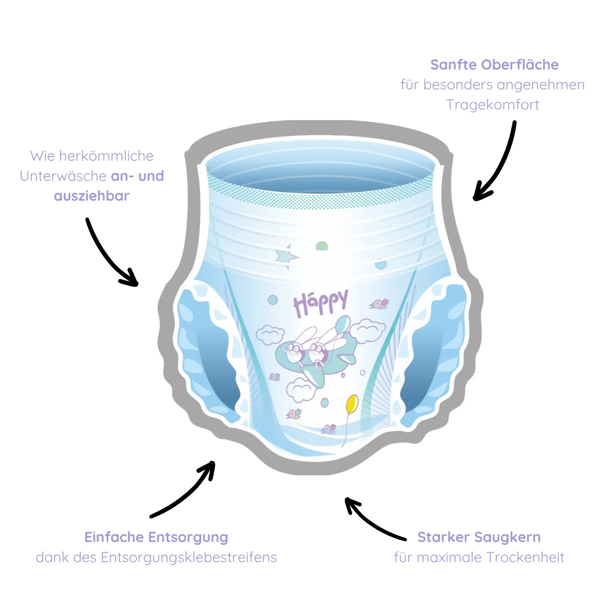 Dank des durchdachten Quick & Easy Systems lassen sich die Pants wie normale Unterwäsche hochziehen und bei Bedarf seitlich aufreißen. Perfekt für aktive Babys und kleine Wickelverweigerer. - Extra weicher Bund – für maximale Bewegungsfreiheit