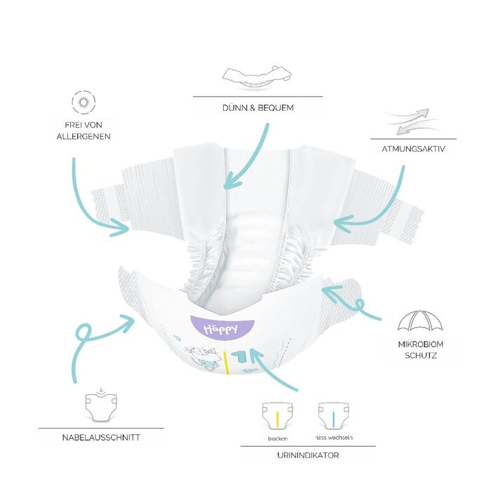 Unsere bella baby Happy Windeln Soft & Delicate haben nicht nur ein tolles Design, sondern sind zudem super weich und besonders für die empfindliche Haut Deines Babys geeignet. Der Nabelausschnitt an den Vorderseiten der Windeln Größe 0 und 1 stellt sicher, dass der Bauchnabel ganz ohne zusätzliche Reizungen verheilen kann.