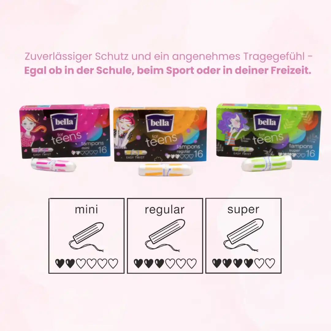 - Extra für dich gemacht: Egal ob es die erste Periode ist oder du bereits Erfahrungen gesammelt hast – die bella for Teens Super Tampons sind speziell für Mädchen und Teenager gemacht!