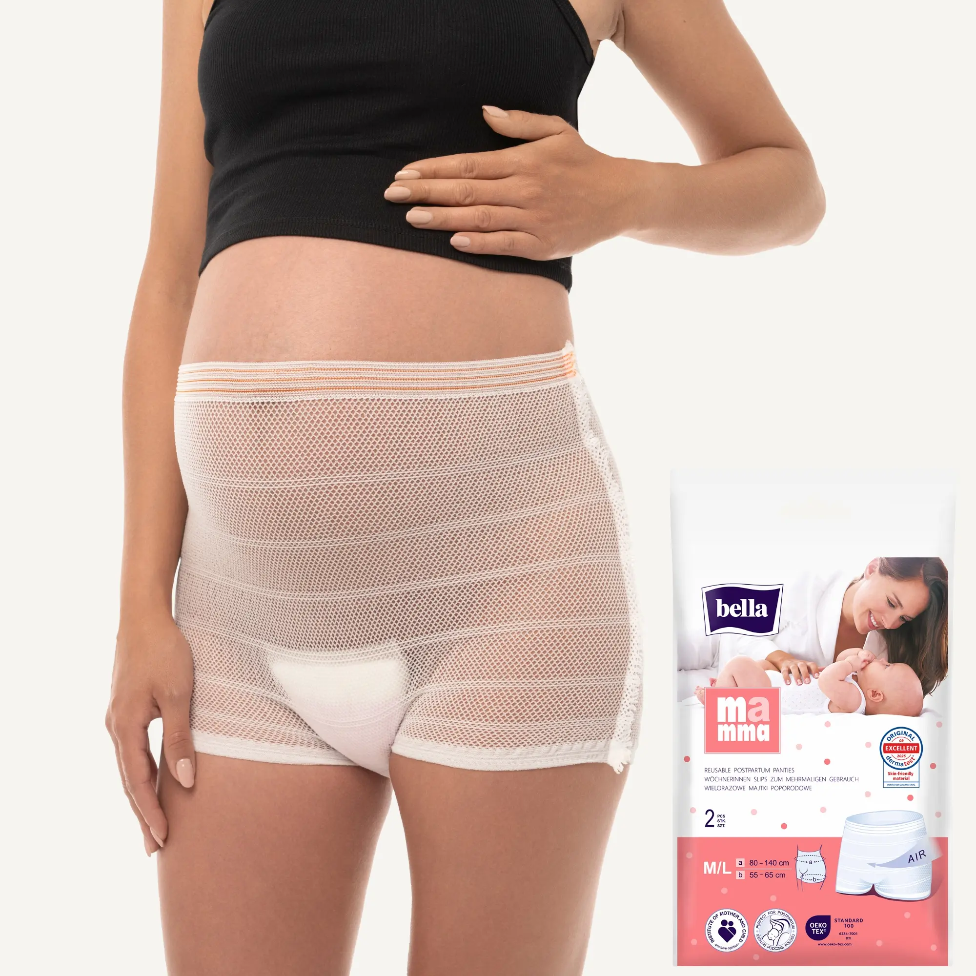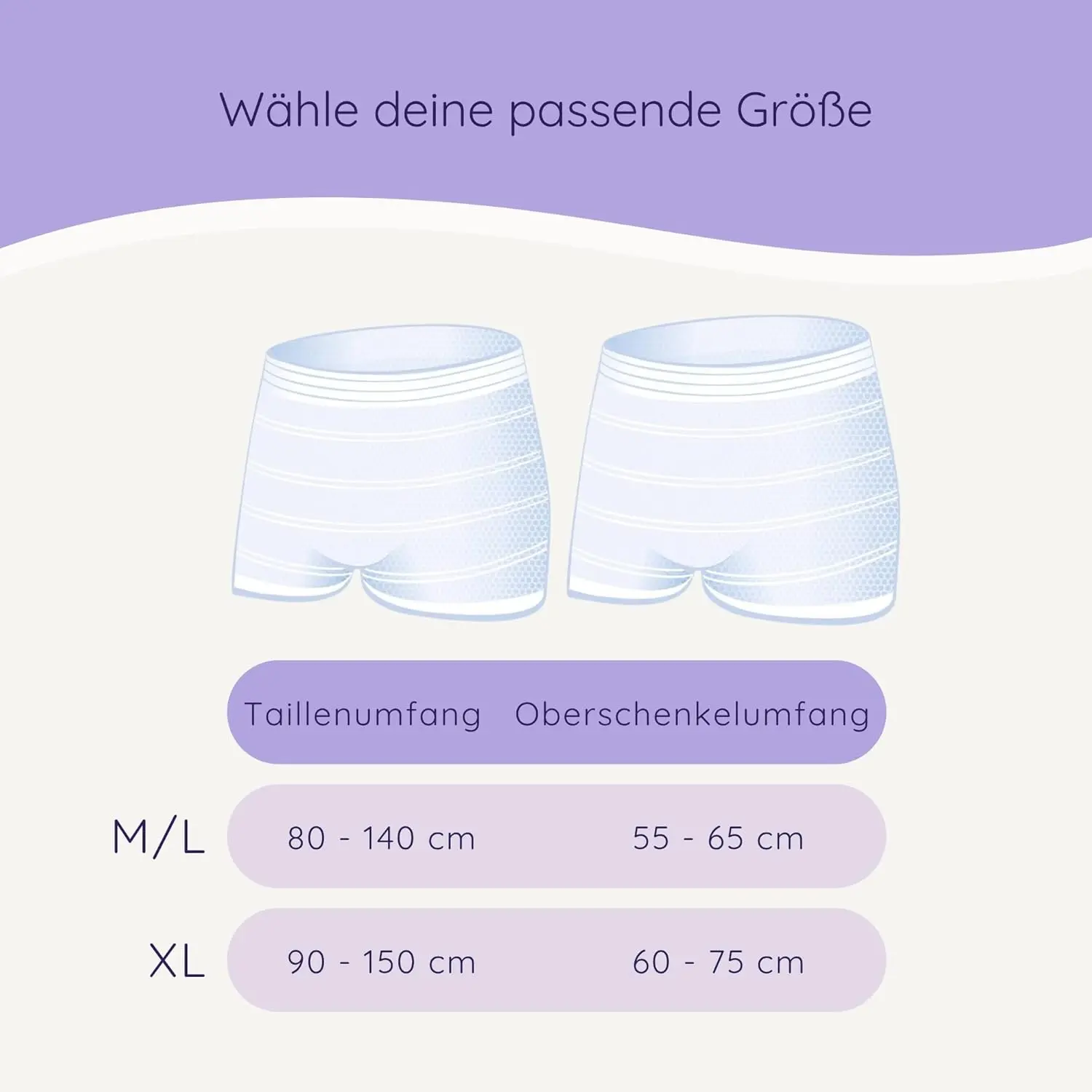 Das Set besteht aus extra weichen, atmungsaktiven Hygienevorlagen (45 Stück) und wiederverwendbaren, elastischen Wochenbett-Slips (6 Stück), die optimalen Halt und ein angenehmes Tragegefühl bieten. Die Slips sind in den Größen M/L (80–140 cm Hüftumfang) oder XL (90–160 cm Hüftumfang) erhältlich und passen sich sanft Deinem Körper an – für maximale Bewegungsfreiheit ohne Druckgefühl.