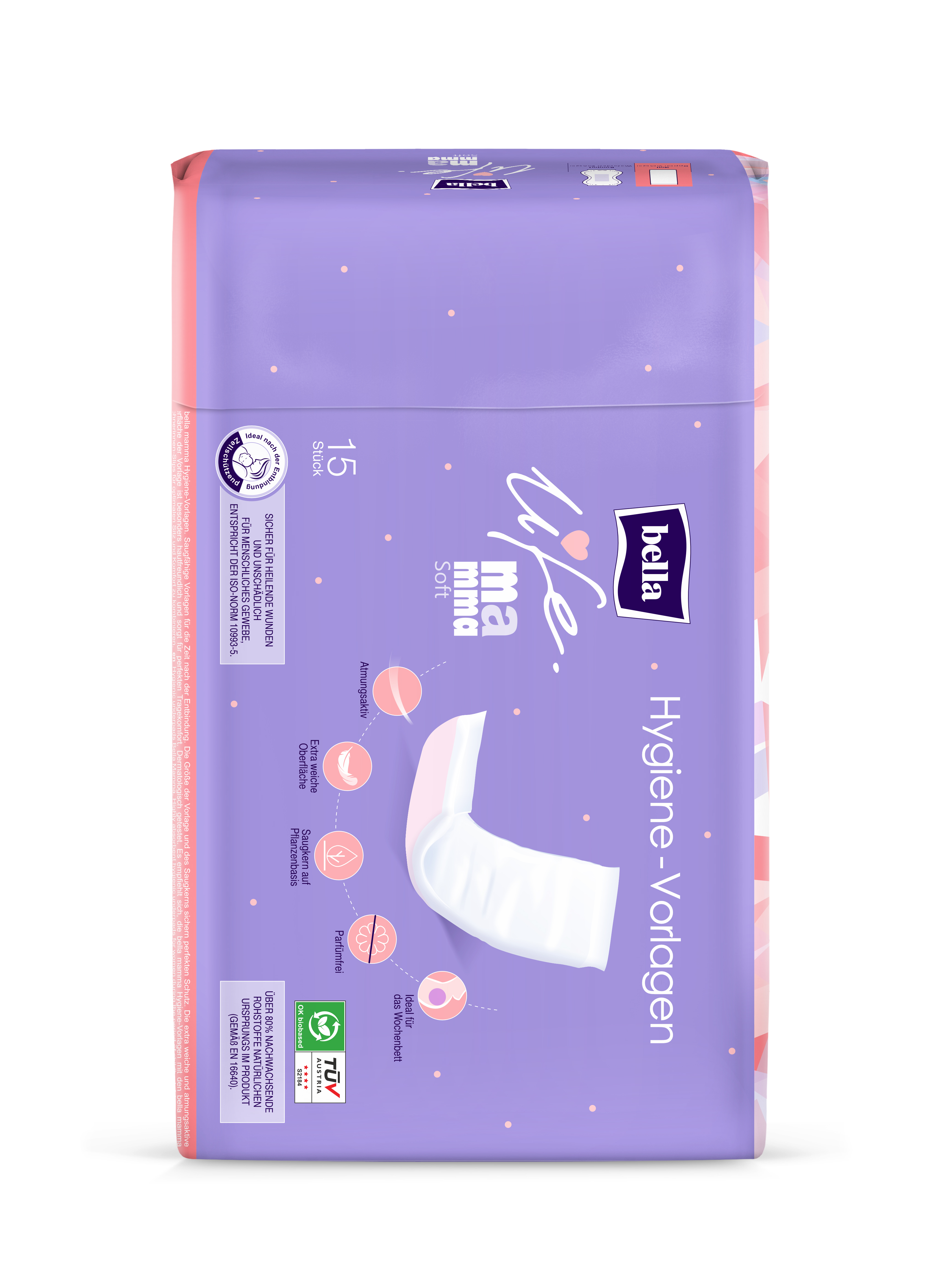 Die Hygienevorlagen besitzen eine saugstarke Einlage auf Pflanzenbasis, die zuverlässig Flüssigkeit aufnimmt, während die atmungsaktive Oberfläche für ein frisches Hautgefühl sorgt. Sie sind parfümfrei und sanft zu sensibler Haut – perfekt für die Zeit nach der Geburt.