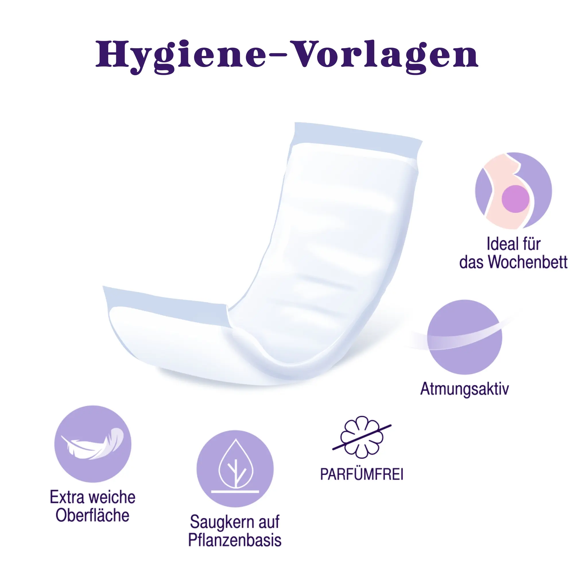 Die Hygienevorlagen besitzen eine saugstarke Einlage auf Pflanzenbasis, die zuverlässig Flüssigkeit aufnimmt, während die atmungsaktive Oberfläche für ein frisches Hautgefühl sorgt. Sie sind parfümfrei und sanft zu sensibler Haut – perfekt für die Zeit nach der Geburt.