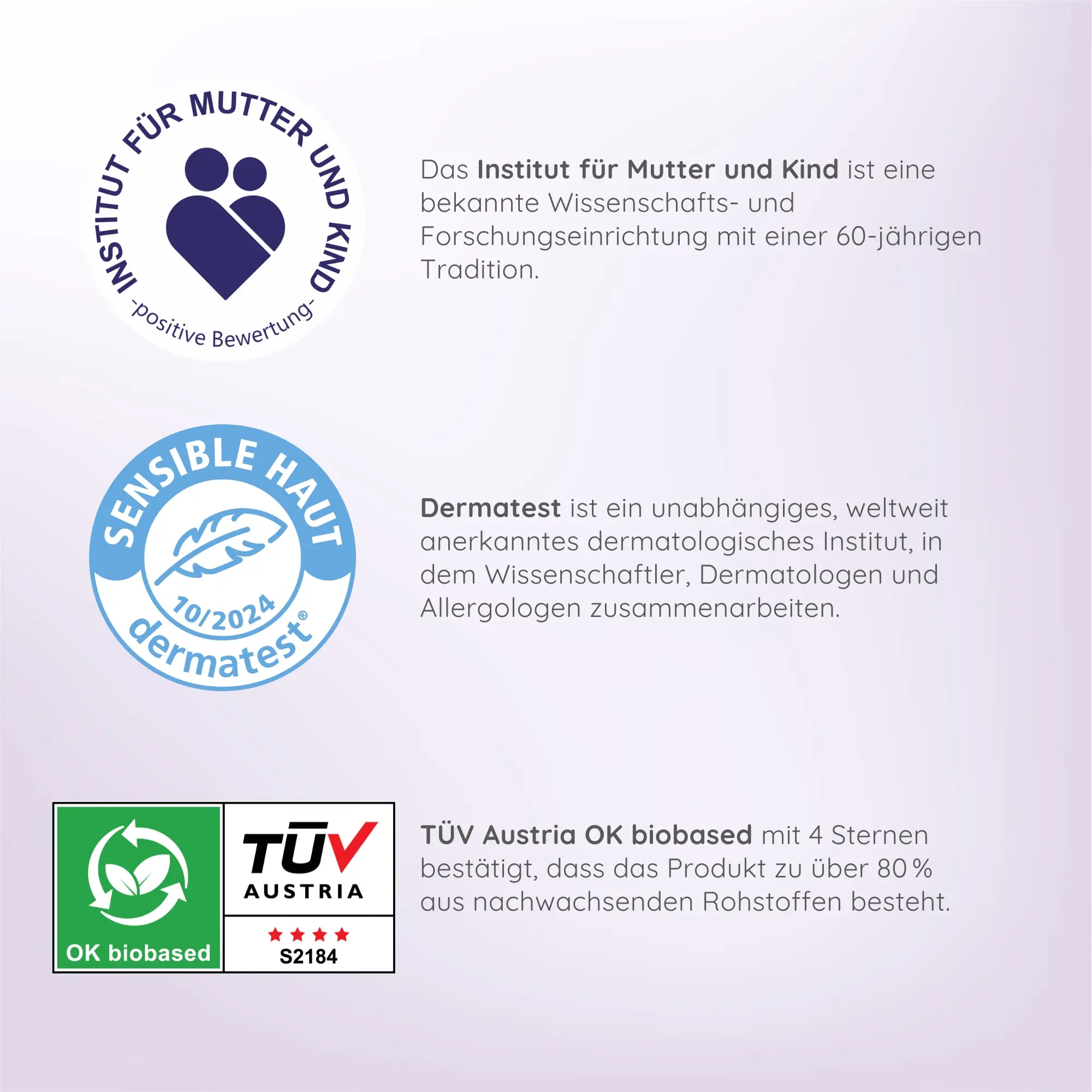 - Dermatest® Siegel – dermatologisch getestet, hautfreundlich und sicher.