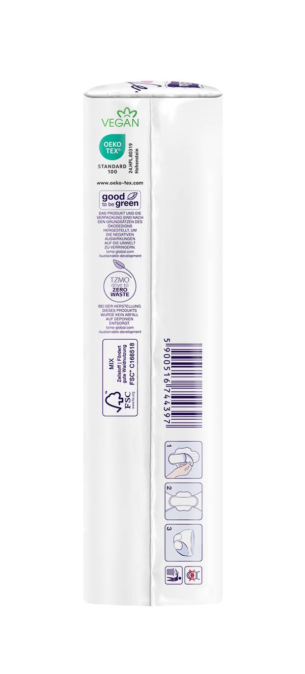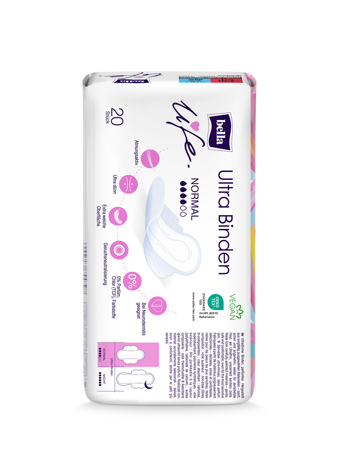 Mit einer Saugstärke von 4 von 6 Tropfen bieten die Ultra Binden zuverlässigen Schutz bei mittlerer Menstruationsstärke. Sie nehmen Flüssigkeit schnell auf und schließen sie sicher im Inneren ein – für ein langanhaltendes Trockenheitsgefühl. Durch den Verzicht auf Parfüm, Chlor und Farbstoffe sind sie besonders hautfreundlich und auch für Allergikerinnen geeignet.