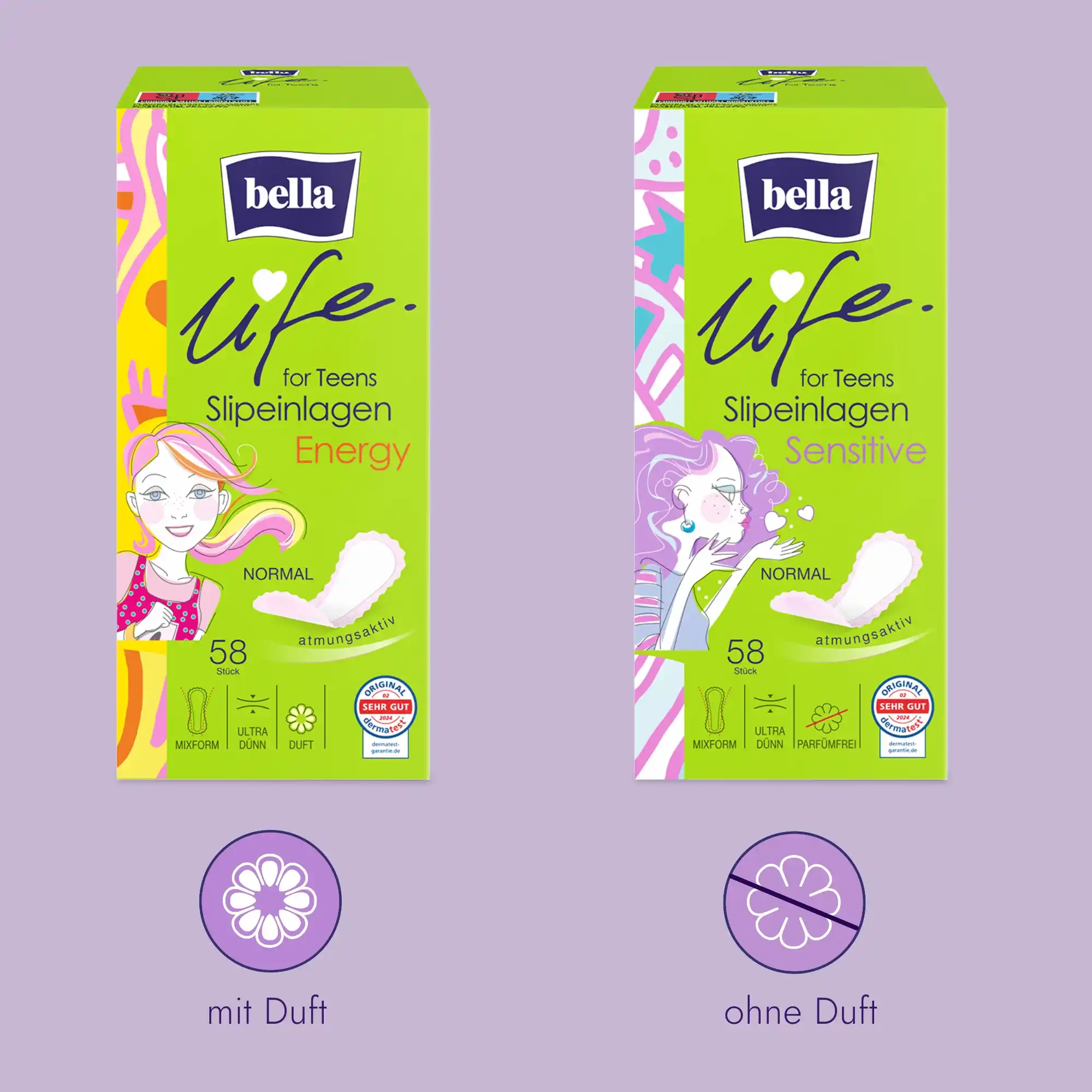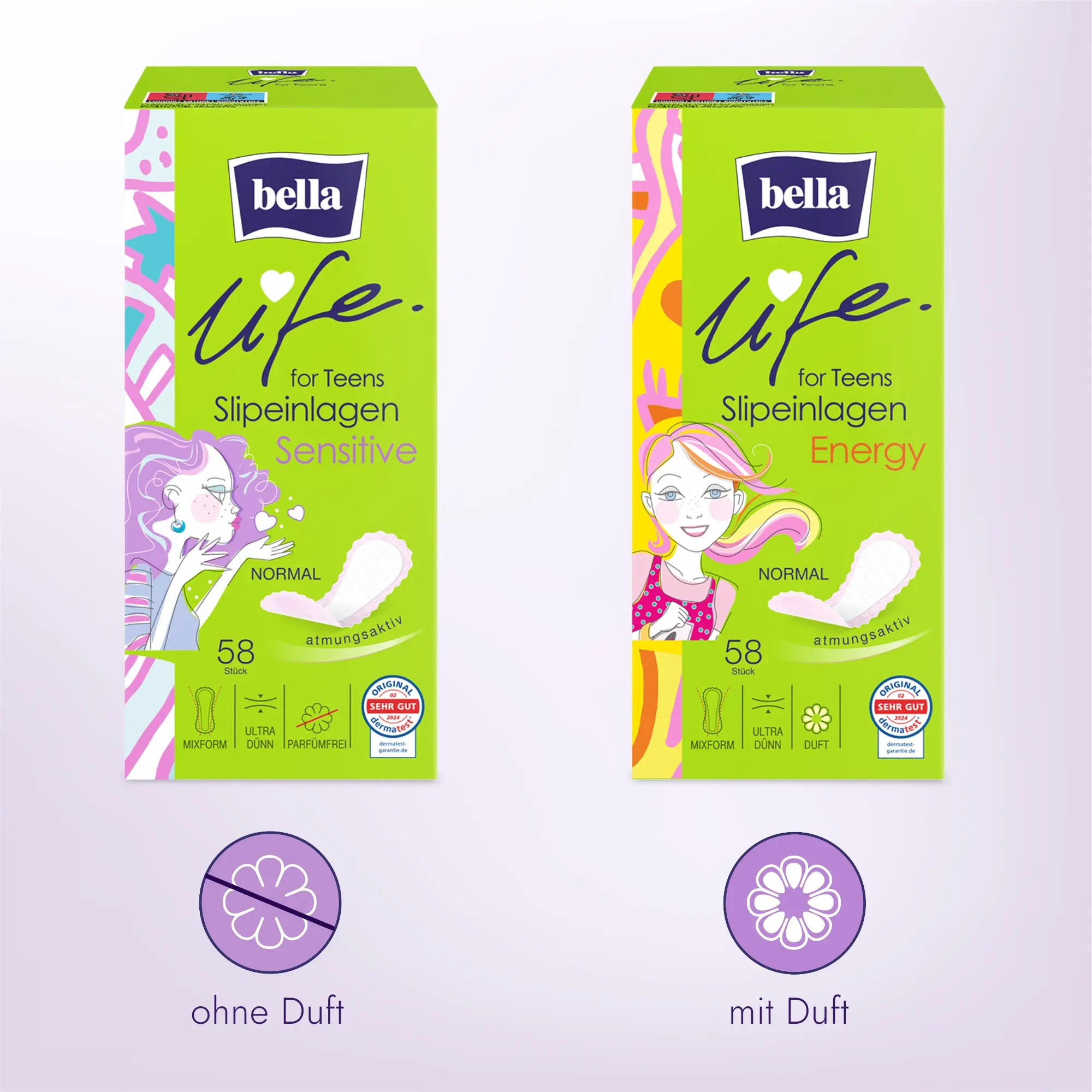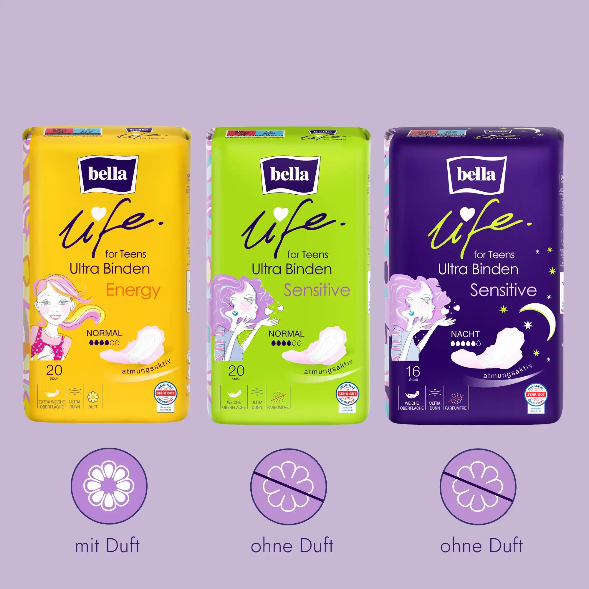 - Enthält: 1x bella life for Teens Ultra Binden Sensitive Normal 20 Stück, 1x bella life for Teens Ultra Binden Sensitive Nacht 16 Stück, 1x bella life for Teens Ultra Binden Energy 20 Stück, 1x bella life for Teens Slipeinlagen Sensitive Normal 58 Stück & 1x bella life for Teens Slipeinlagen Energy Normal 58 Stück