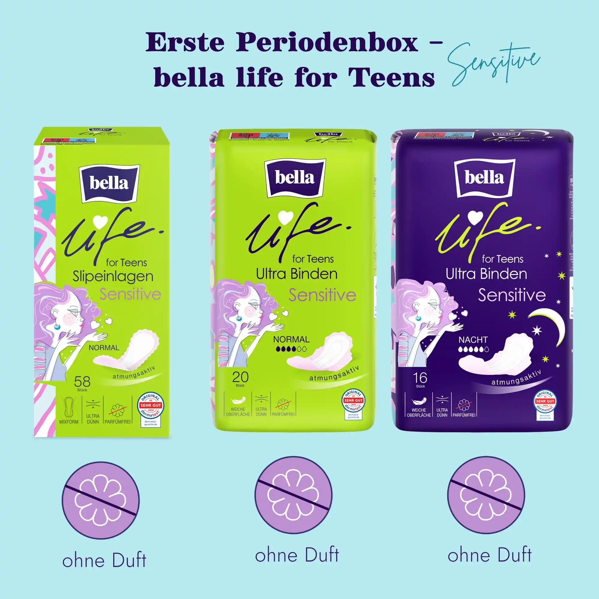 - Enthält: 1x bella life for Teens Ultra Binden Sensitive Normal 20 Stück, 1x bella life for Teens Ultra Binden Sensitive Nacht 16 Stück & 1x bella life for Teens Slipeinlagen Sensitive Normal 58 Stück