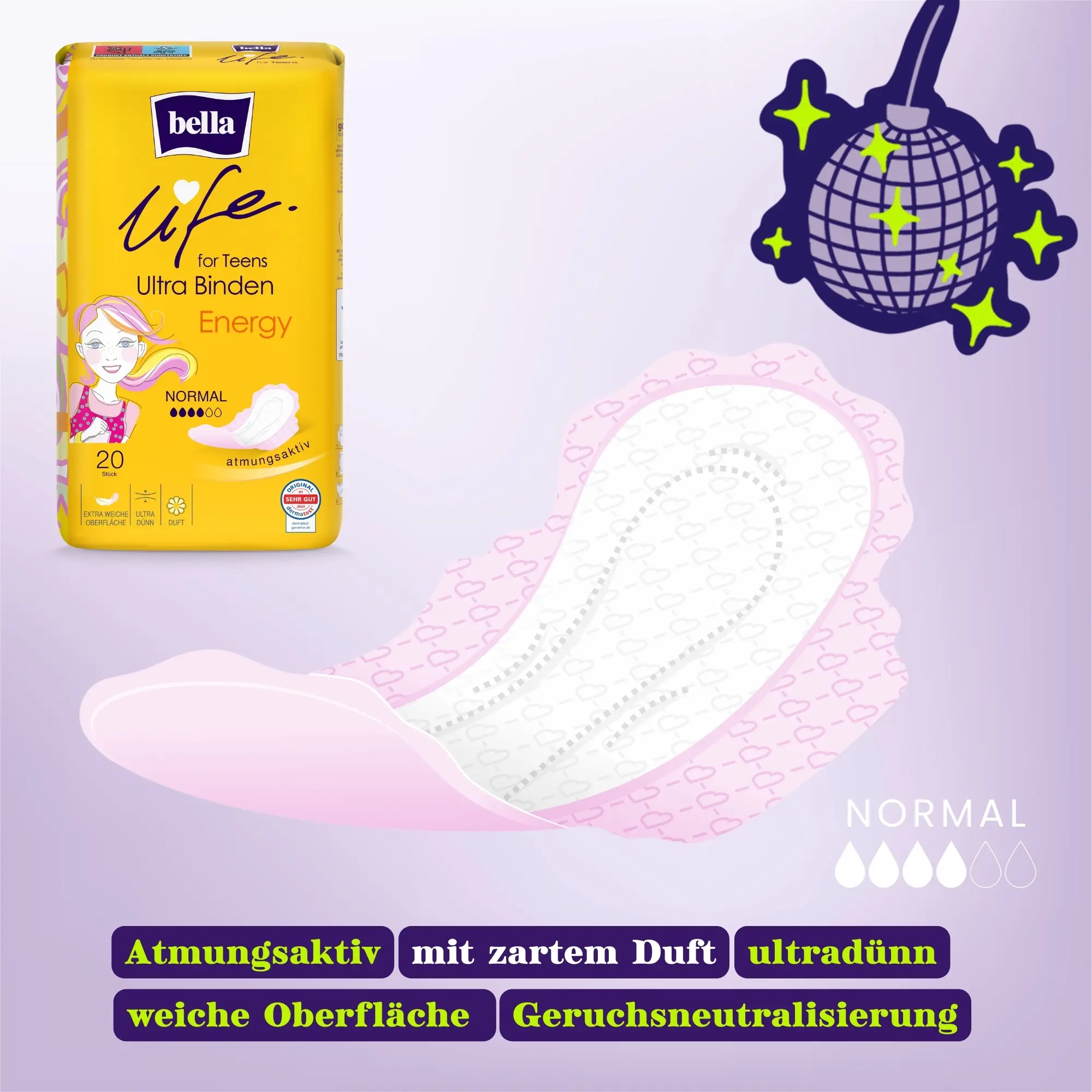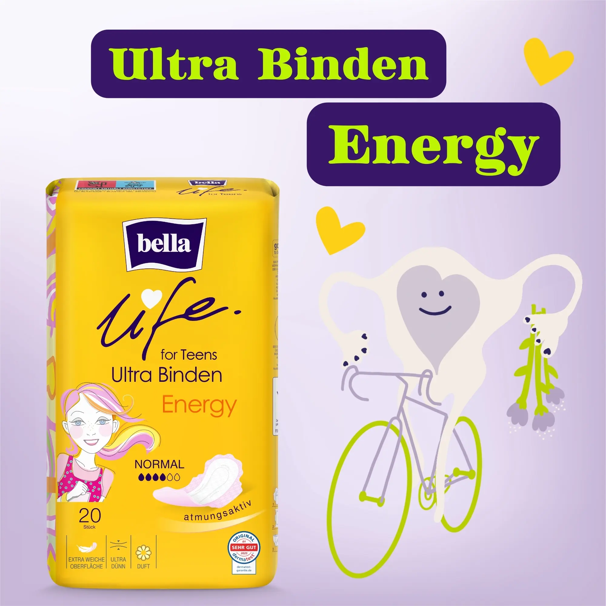 Die bella life for Teens Ultra Binden Energy sind genau auf deinen aktiven Alltag abgestimmt – ob Schule, Sport oder Freizeit. Sie sind ultra dünn, super angenehm zu tragen und geben dir den ganzen Tag über ein sicheres Gefühl.