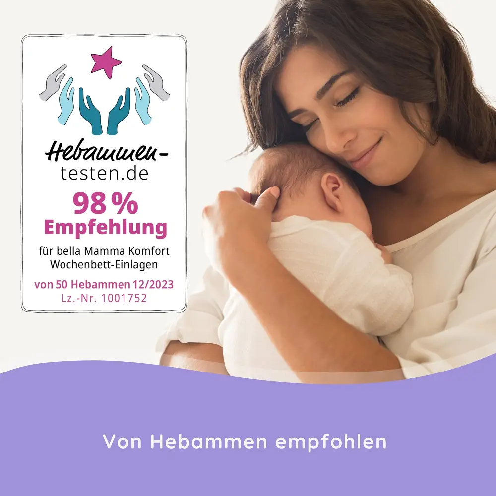 Die hohe Qualität wurde auch im Praxistest bestätigt: 98 % der befragten Hebammen empfehlen die bella life Mamma Wochenbett-Einlagen weiter (Hebammen-testen.de, 10/2023).