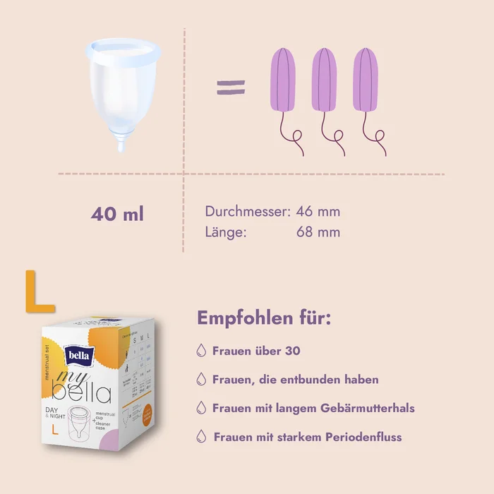 Ideal nicht nur für unterwegs und auf Reisen, sondern auch im Alltag: Der my bella Periodencup mit dem praktischen Behälter, der die Sterilisation, die Aufbewahrung und die Desinfektion nach der Menstruation kinderleicht macht. Mit der Tasse sparst du nicht nur Geld für immer stetig neue Periodenprodukte, sondern schonst auch die Umwelt. Der bequeme Cup hält auch bei Sport und beim schwimmen sicher. Dabei ist die Menstruationstasse aus medizinischem Silikon hergestellt, das hypoallergen, biokompatibel, latexfrei und verträglich ist. Das bestätigen dermatologische Tests. Dass jede von uns die passende Größe findet, garantieren die drei erhältlichen Größen. Die Tasse kann dem Behälter vor dem ersten Einsetzen, sowie nach der Menstruation gereinigt werden. Während der Periode maximal 12 Stunden eingesetzt lassen. Danach das Blut in der Toilette entsorgen und vor dem erneuten Einführen der Periodentasse reinigen.