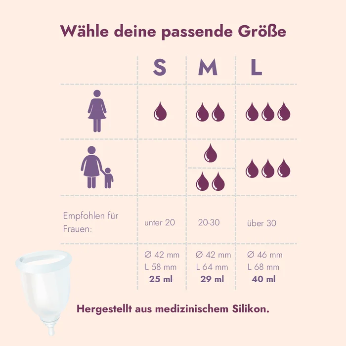 - Stets passend: Die Menstruationstasse gibt es in drei verschiedenen Größen, sodass jede von uns die perfekte Passform findet.