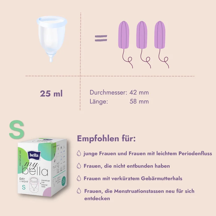 Ideal nicht nur für unterwegs und auf Reisen, sondern auch im Alltag: Der my bella Periodencup mit dem praktischen Behälter, der die Sterilisation, die Aufbewahrung und die Desinfektion nach der Menstruation kinderleicht macht. Mit der Tasse sparst du nicht nur Geld für immer stetig neue Periodenprodukte, sondern schonst auch die Umwelt. Der bequeme Cup hält auch bei Sport und beim schwimmen sicher. Dabei ist die Menstruationstasse aus medizinischem Silikon hergestellt, das hypoallergen, biokompatibel, latexfrei und verträglich ist. Das bestätigen dermatologische Tests. Dass jede von uns die passende Größe findet, garantieren die drei erhältlichen Größen. Die Tasse kann dem Behälter vor dem ersten Einsetzen, sowie nach der Menstruation gereinigt werden. Während der Periode maximal 12 Stunden eingesetzt lassen. Danach das Blut in der Toilette entsorgen und vor dem erneuten Einführen der Periodentasse reinigen.